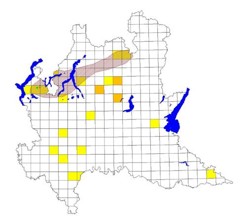 Figura 8.2. Distribuzione del Rinolofo minore (Rhinolophus hipposideros) in Lombardia.